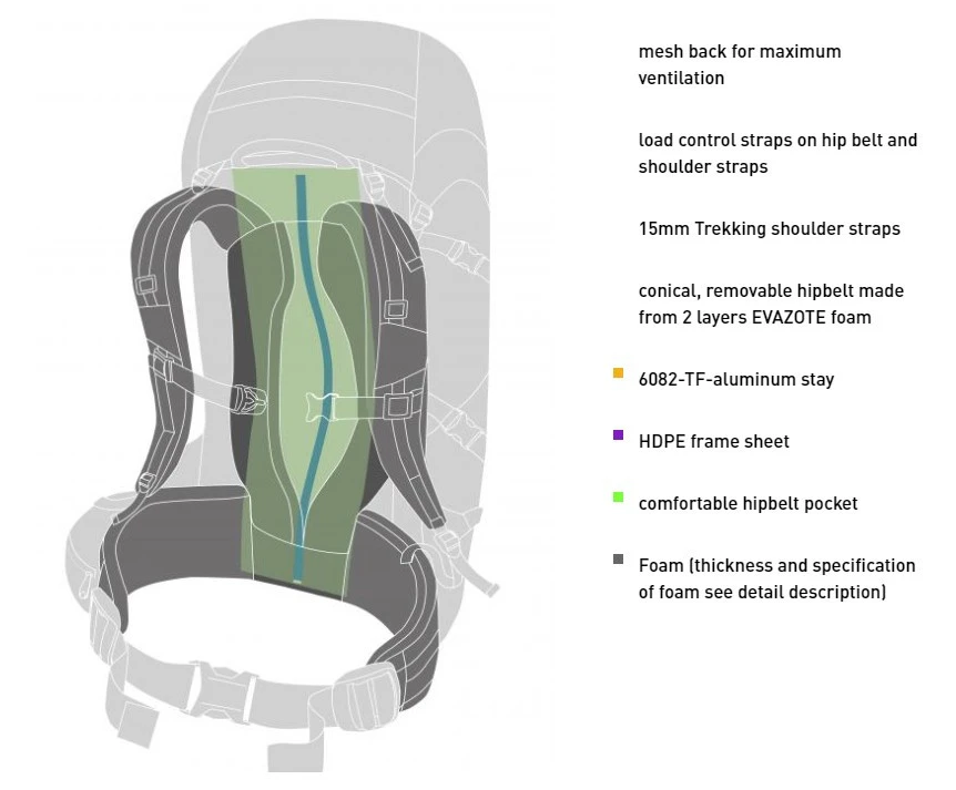 Il prévu pour être confortable jusqu’à une charge de 18 kg. Pour cela, son armature dorsale est équipée du système Shield Pro de Bach. Elle se compose d’un filet tendu et d’une mousse à pores ouverts qui apportent ventilation et confort, ainsi qu’une plaque dorsale en HDPE (polyéthylène haute densité). Un rail courbé en aluminium, placé sur toute la hauteur du sac à dos, assure le maintien et la rigidité de l’ensemble. Les bretelles et la ceinture sont composées de couches de mousses EVA épaisses.
