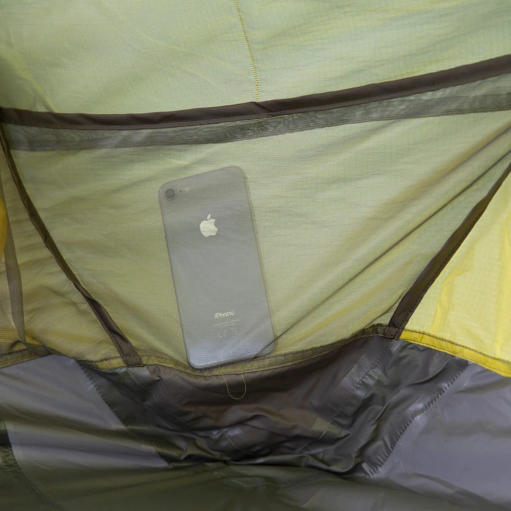 Assez facile à monter, elle se compose de trois arceaux et d’un mât central. Elle dispose d’une entrée principale sur l’avant et de deux petites ouvertures sur les côtés, plus facile pour s’organiser ainsi que pour moduler l’aération. Toutes les portes sont doublées en moustiquaire et il est possible de les ouvrir complètement en les stockant dans les poches prévues à cet effet. De nombreuses poches et systèmes de suspension se trouvent à l’intérieur. Trois grandes aérations sur le dessus.