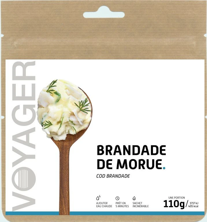 | Ingrédients | Purée de pommes de terre déshydratée 83% (flocons de pommes de terre, lait ½ écrémé, sel), morue cuisinée lyophilisée 8,7% (morue, lait ½ écrémé, court bouillon, épices et aromates, huile d’olive), matière grasse végétale (huile de tournesol, sirop de glucose, protéines de lait), fumet de poisson (poisson, sel, sucre, maltodextrine, huile de tournesol et de palme, arômes, levure, acidifiant : acide citrique, légumes, fécule, vin blanc, épices et aromates), sel, épices et aromates. |