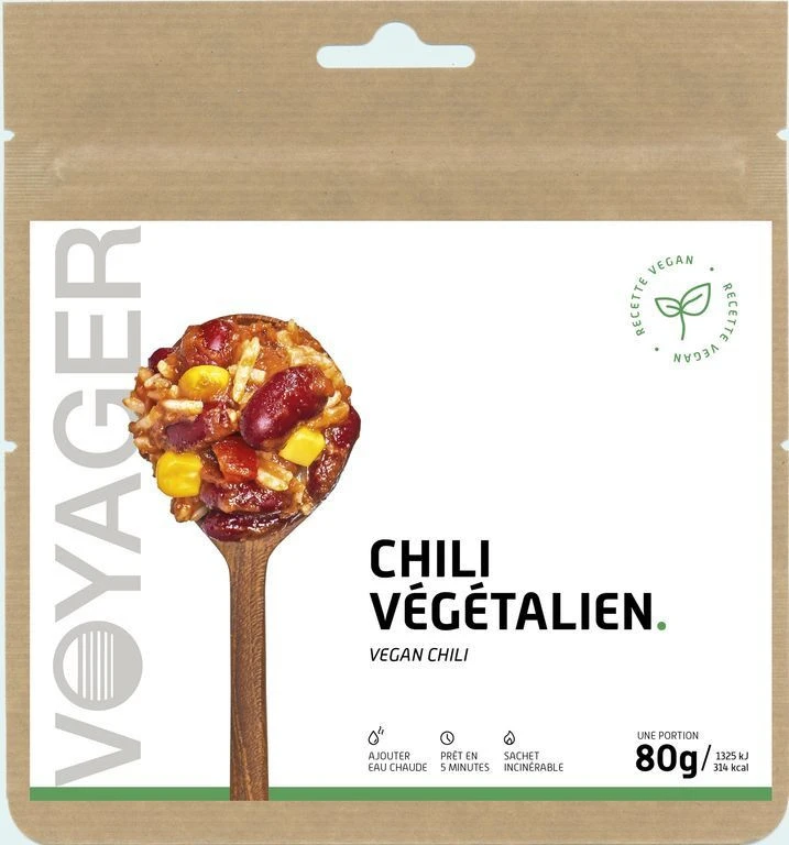 Le Chili Végétarien Voyager est un savoureux mélange de légumes craquants, de riz et d’onctueux haricots rouges, sous forme lyophilisée.