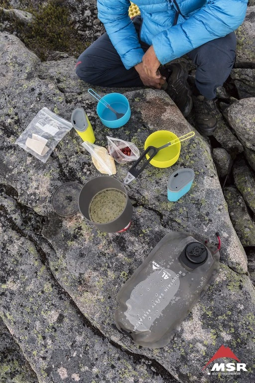 Débit réglable en fonction de l’ouverture (bec verseur, goulot large, ouverture totale). Matériaux résistants et légers. Poignée de transport. Oeillets pour le suspendre ou l’attacher à un sac à dos. Vache à eau disponible en 2, 4, 6 litres. Compatible avec les filtres à eau MSR.