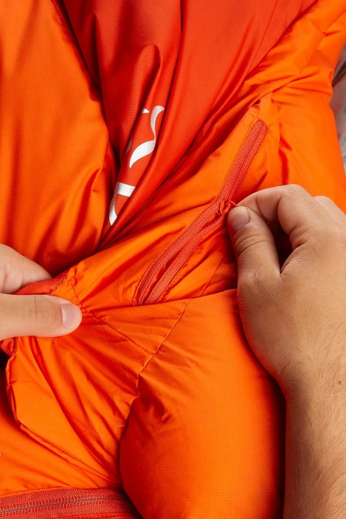 Le sac de couchage Andes Infinium 800 de Rab a été optimisé pour proposer un excellent ratio chaleur/poids/encombrement. Il est garni de 800 grammes de duvet d’oie européen hydrophobe certifié RDS de 800 cuin. La marque ne communique pas de température de confort pour ses sacs de couchage grand froid, mais de notre expérience, celle-ci est d’environ -12/-15°C.