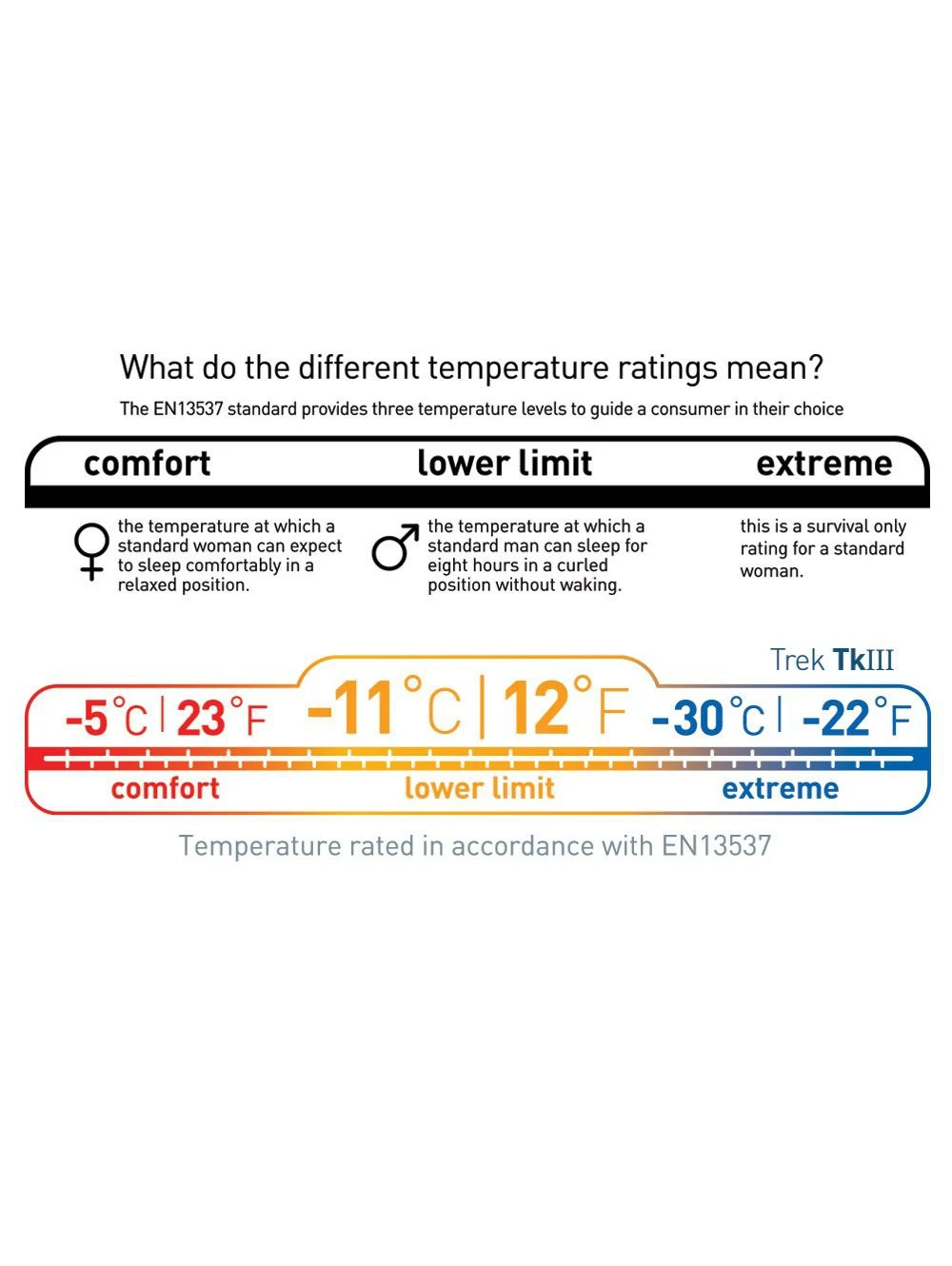 Grâce aux caractéristiques techniques, le Trek TK III obtient une température confort de -5°C ce qui est performant au regard du volume et du poids total du sac de couchage.