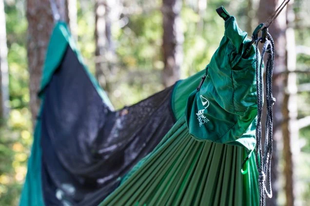 La ligne de crête intégrée permet de garder une forme confortable et de fixer le sac de rangement. Hamac réalise en nylon 20 deniers respirant et à séchage très rapide.